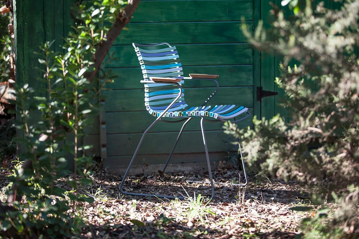 This outdoor dining chair from Houe is part of the Click series, which is designed by Henrik Pedersen. The comfortable chair has an ergonomic design that is very well thought out. Click is made with a frame of powder-coated grey metal, a seat of plastic lamellas and two armrests in bamboo. Available in 14 different colours.