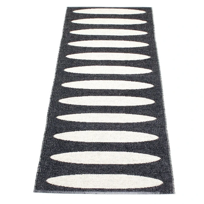 Black / vanilla. PVC and polyester threads. Hand or machine wash at 30 degrees. Do not tumble dry. Stretch the carpet tight when wet and drip dry.