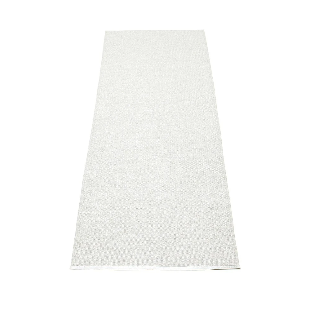 Svea Rug woven in white plastic foil. Metallic white mixed with matte white colour gives a light shimmering effect that gives the rug life and depth. The carpet is easy to clean with a wet cloth or vacuuming. Can also be machine washed. Pappelina Svea Rug can be used both outdoors and indoor.