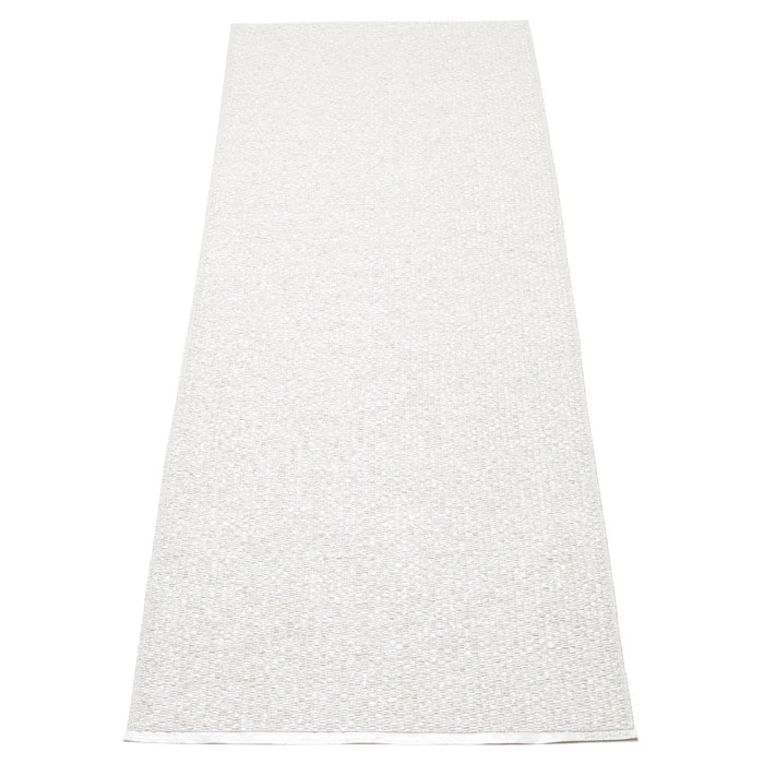 Svea Rug woven in white plastic foil. Metallic white mixed with matte white colour gives a light shimmering effect that gives the rug life and depth. The carpet is easy to clean with a wet cloth or vacuuming. Can also be machine washed. Pappelina Svea Rug can be used both outdoors and indoor.